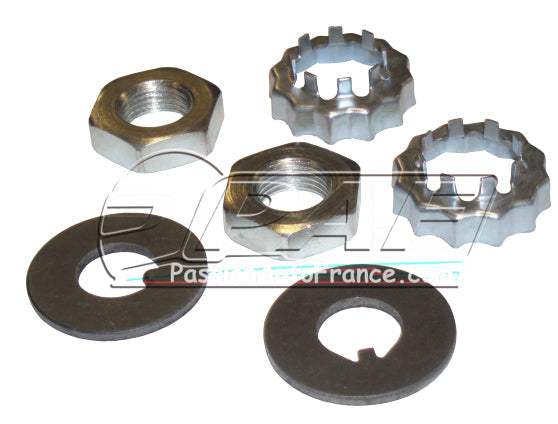 Comprends 2 écrous 6 pans en 5/8 UNF, 2 rondelles d'arrêt et 2 arrêtoirs écrous 6 pans (kit permettant de refaire les 2 cotés du train avant).